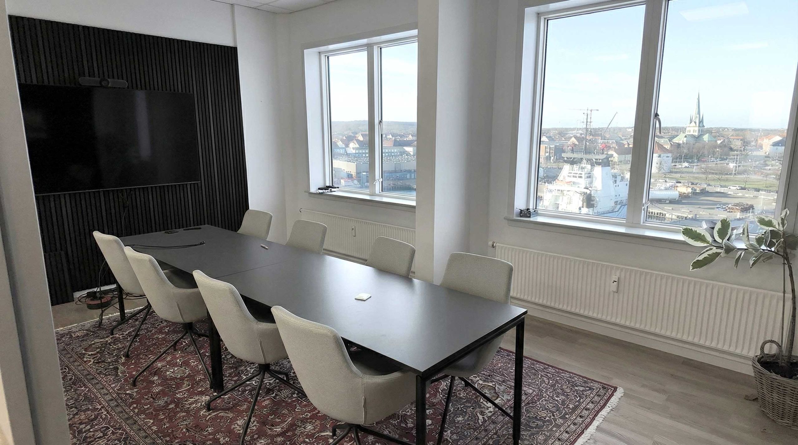 Lyst og rummeligt kontorlejemål til leje på 8. etage i Kattegat Siloen, Frederikshavn – med panoramaudsigt over byen mod vest og havnen og Kattegat mod øst.
