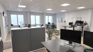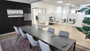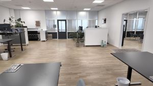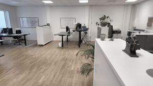 Lejemålet udgør i alt 141 m² og er indrettet med to separate kontorrum samt et elegant mødelokale med glasvæg ud mod det ene kontor – en løsning, der skaber både gennemsigtighed og afskærmet ro. De to kontorrum er forbundet med en åben passage, hvilket skaber et naturligt flow og mulighed for både adskillelse og samarbejde.