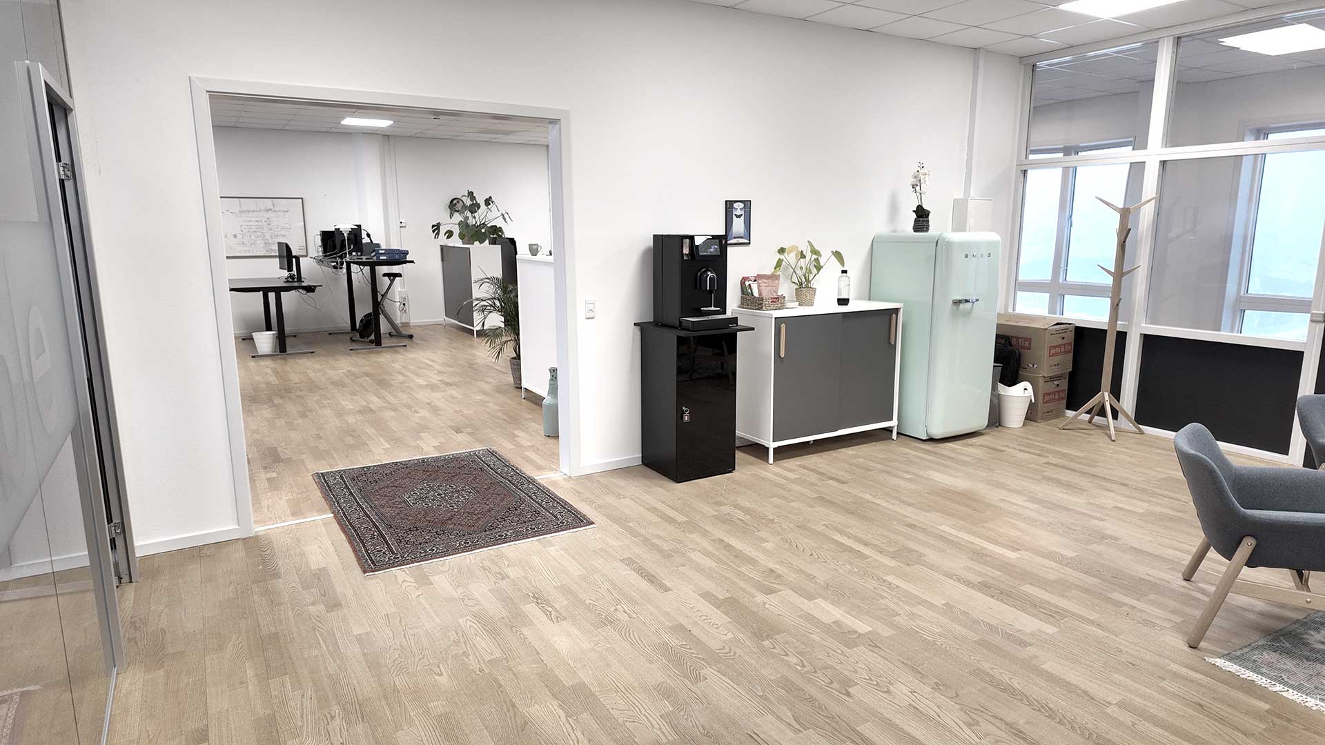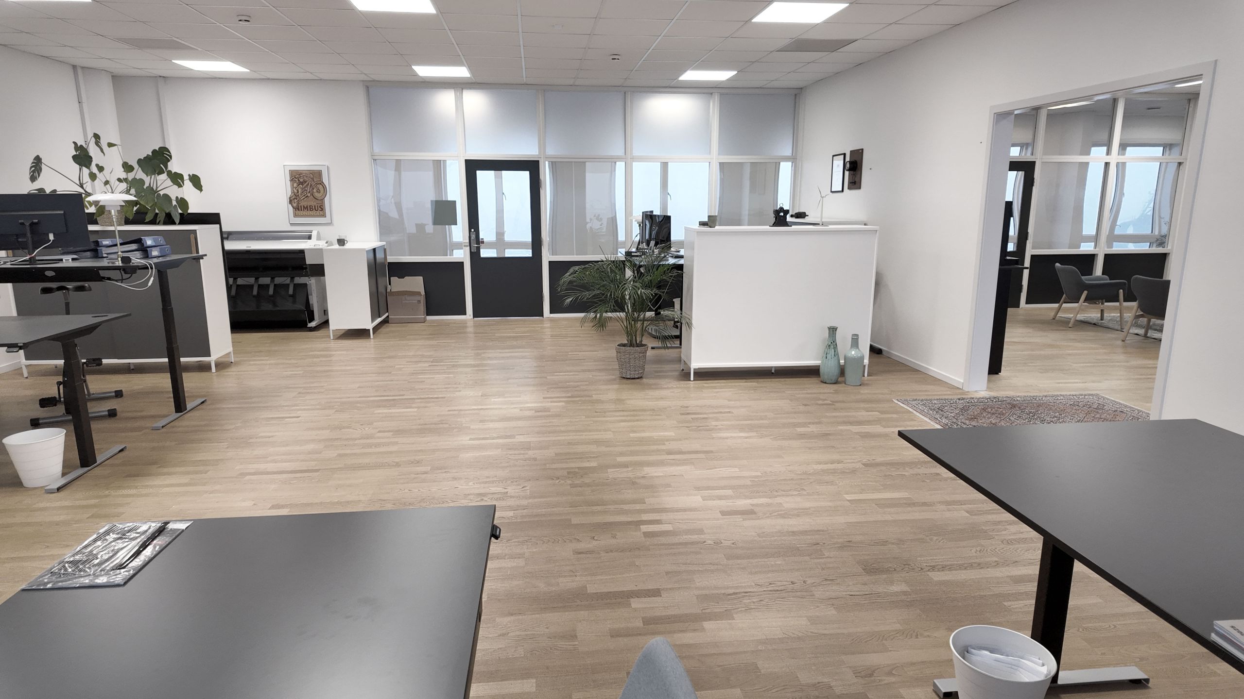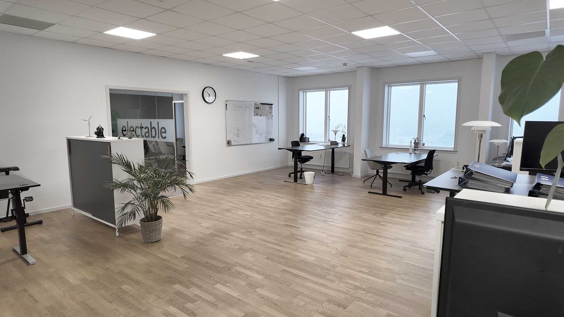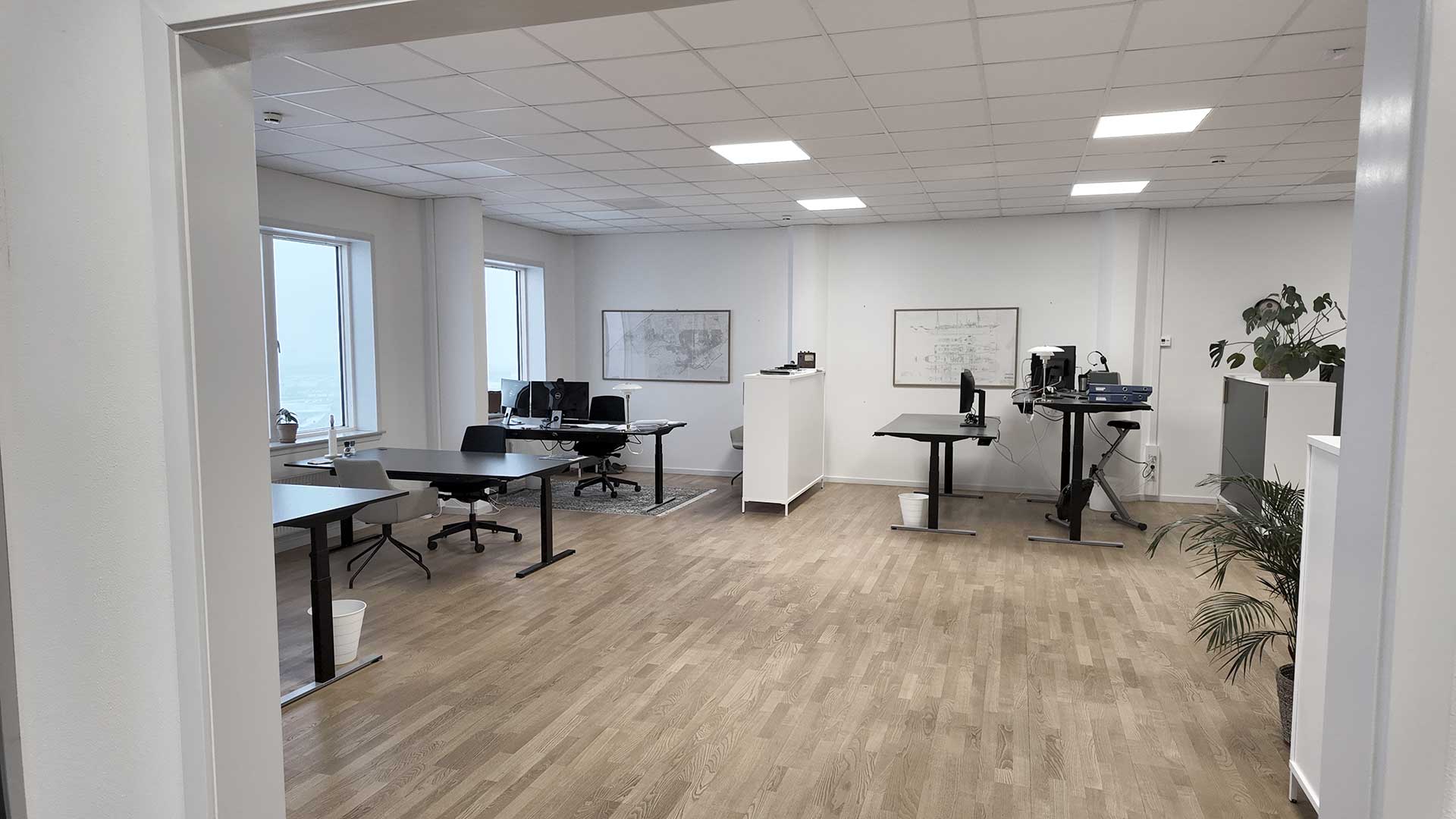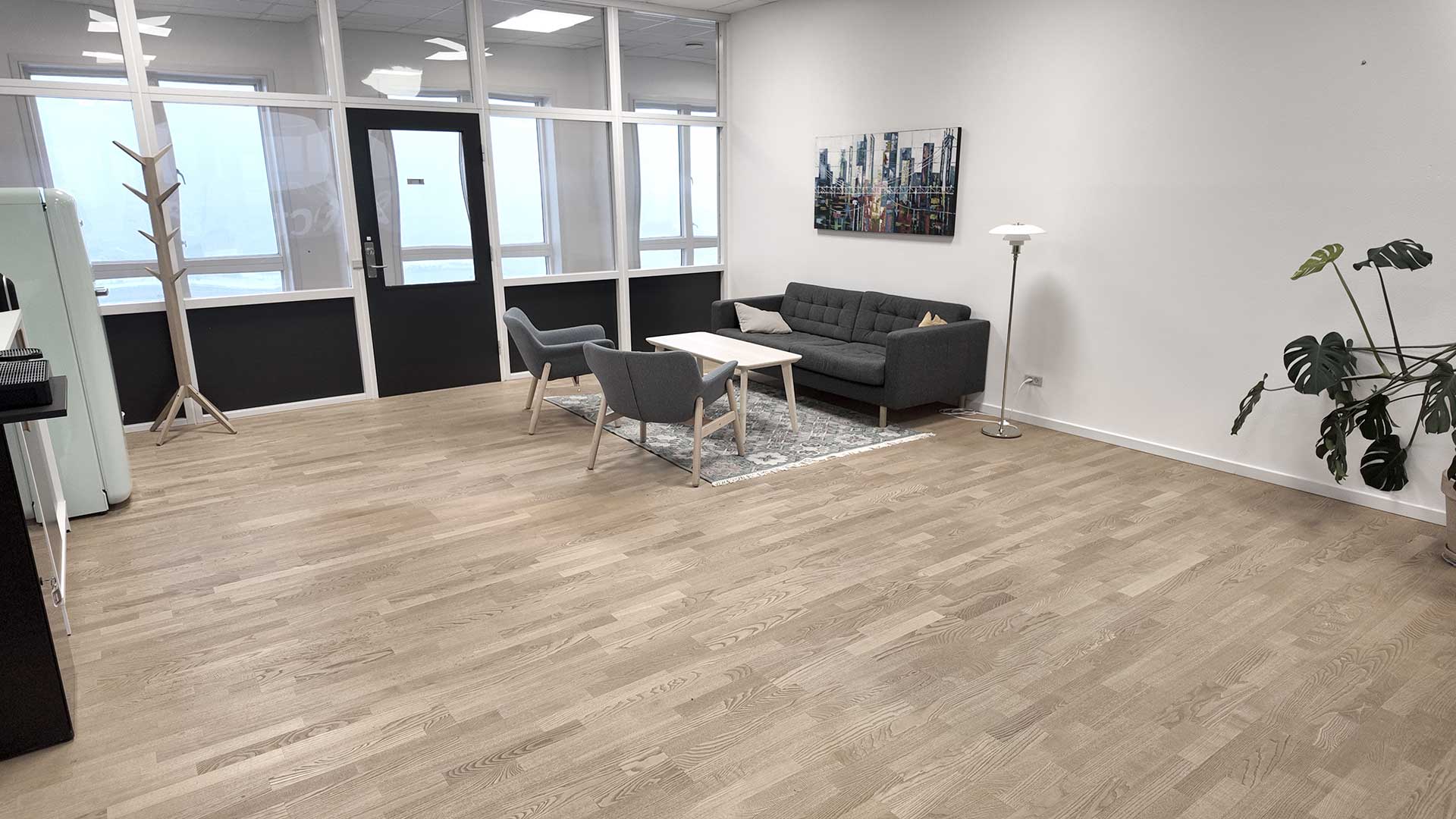 Indretningen er holdt i lyse trægulve, der åbner rummet og giver fleksibilitet ift. både mørke og lyse kontormøbler.