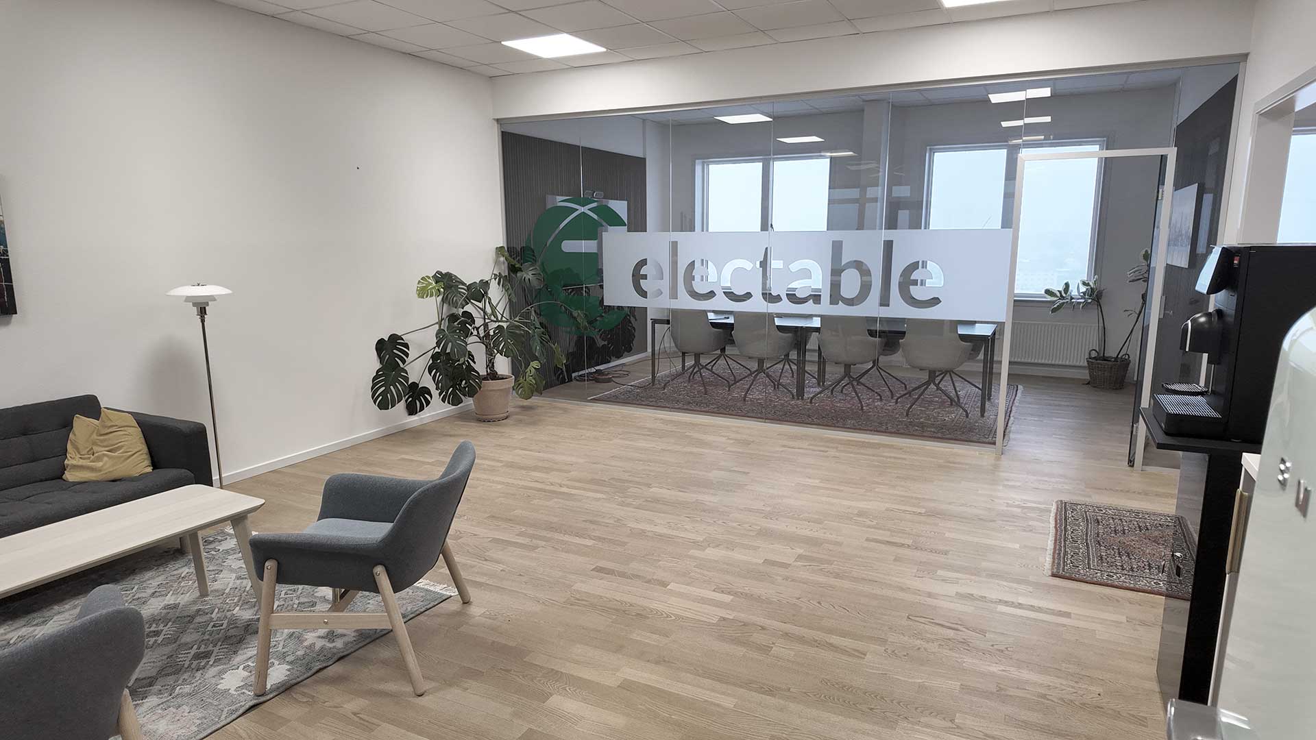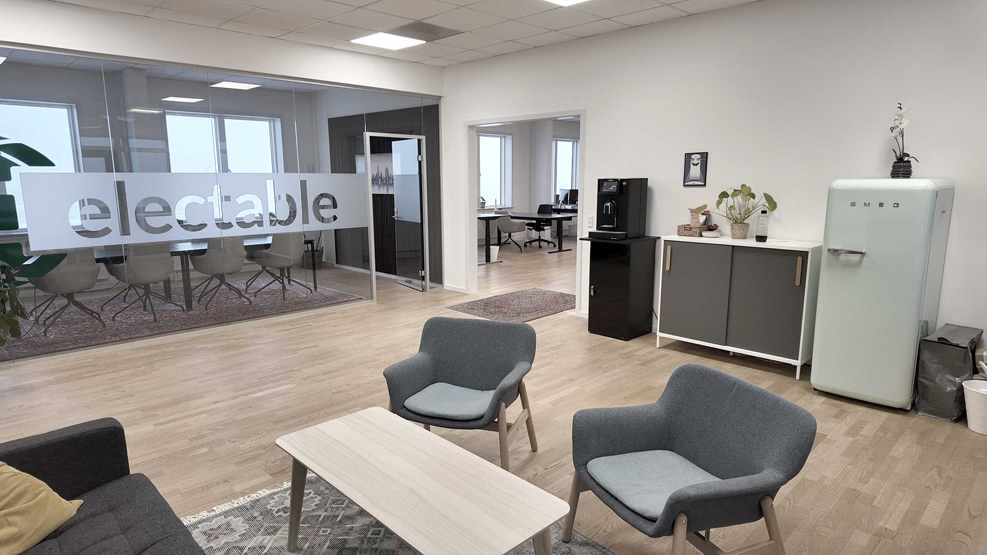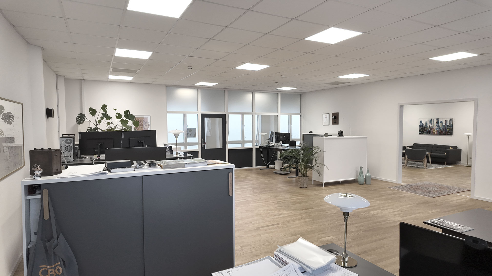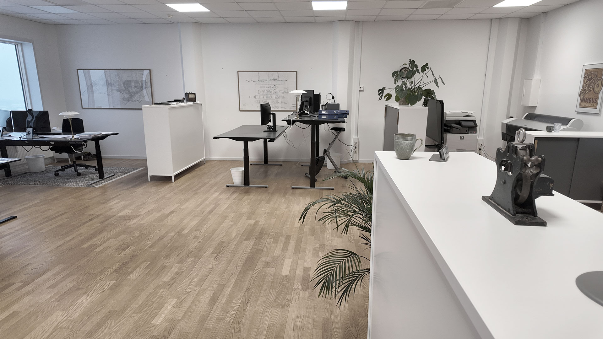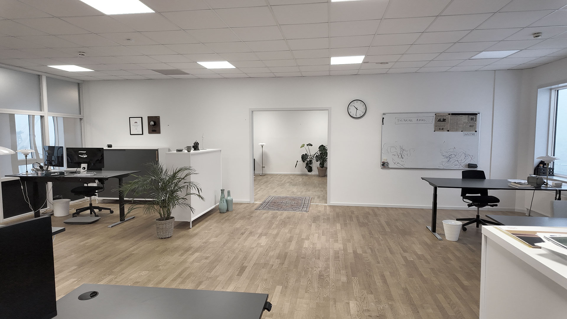 Indretningen er holdt i lyse trægulve, der åbner rummet og giver fleksibilitet ift. både mørke og lyse kontormøbler.